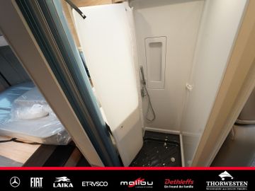 Schwenkbad mit Schwenkwand in Milchglas-Optik, Duschausstattung und Kassettentoilette