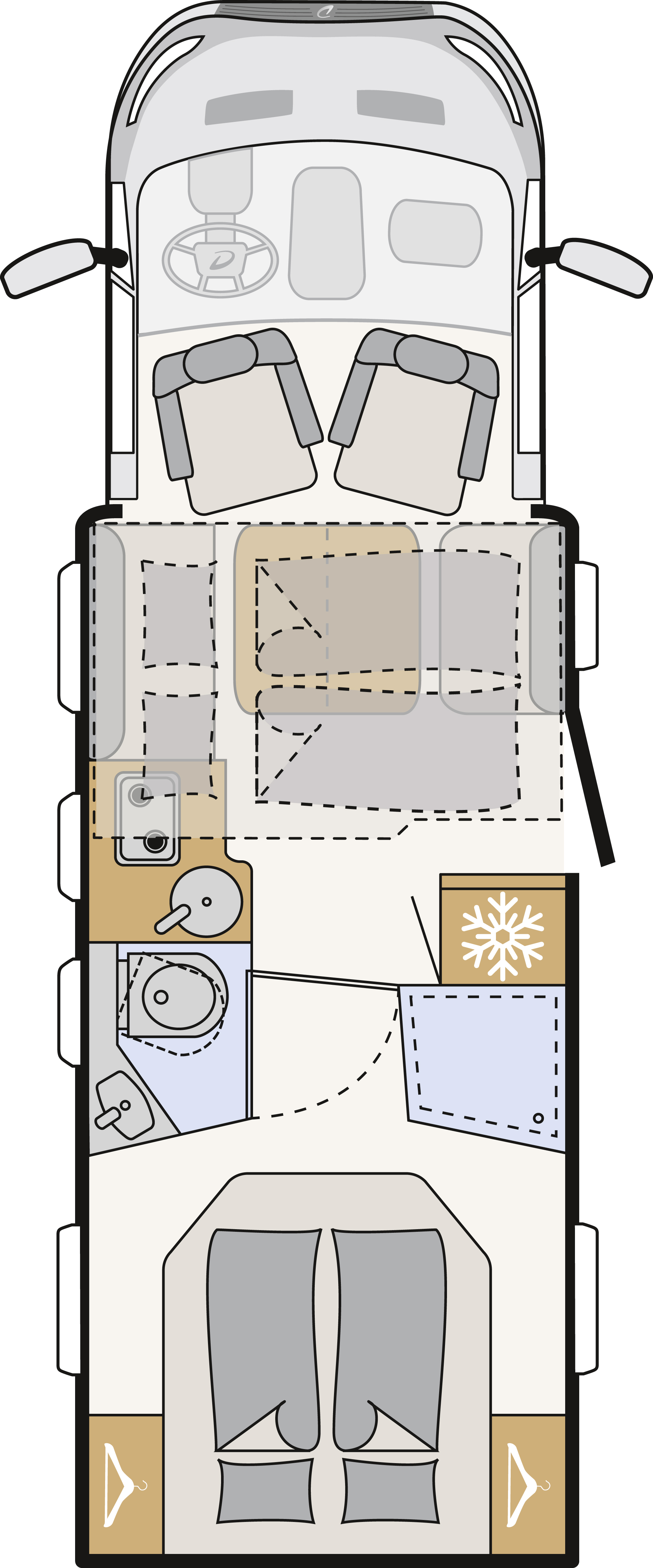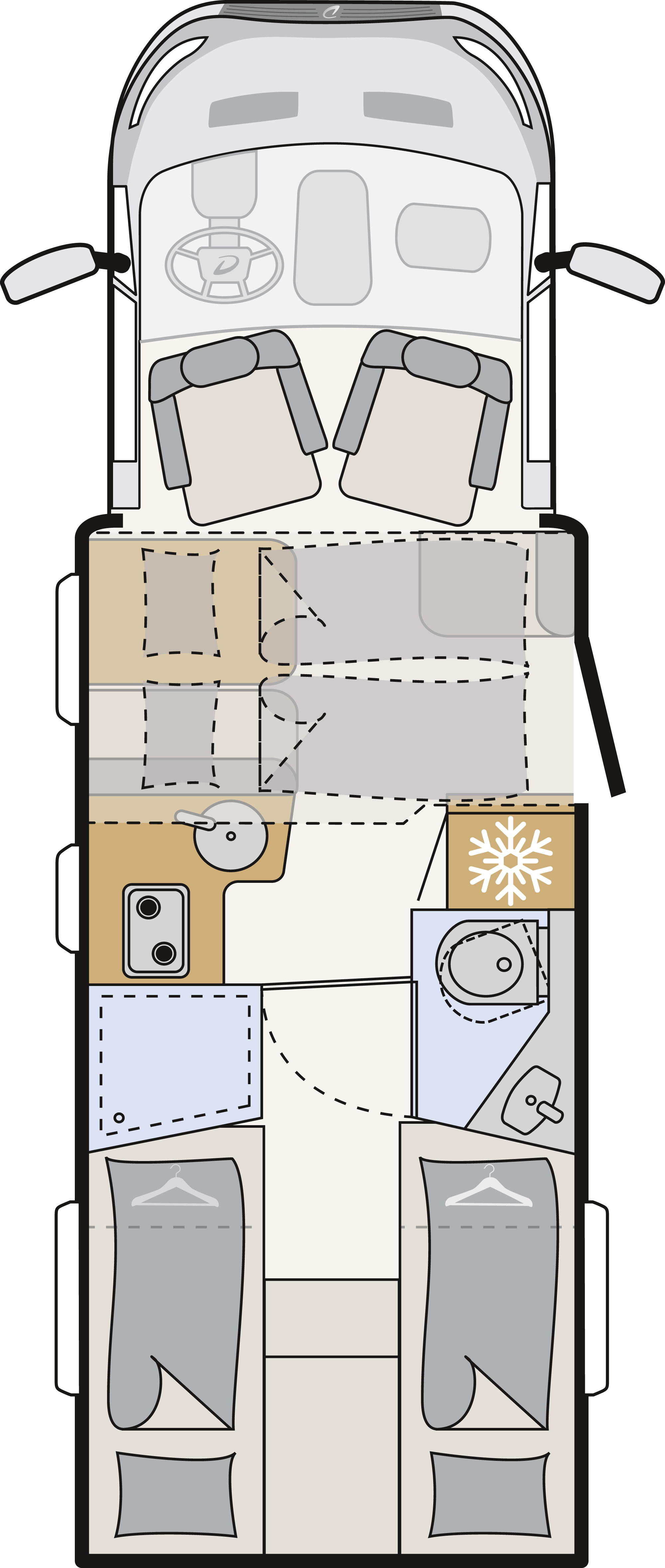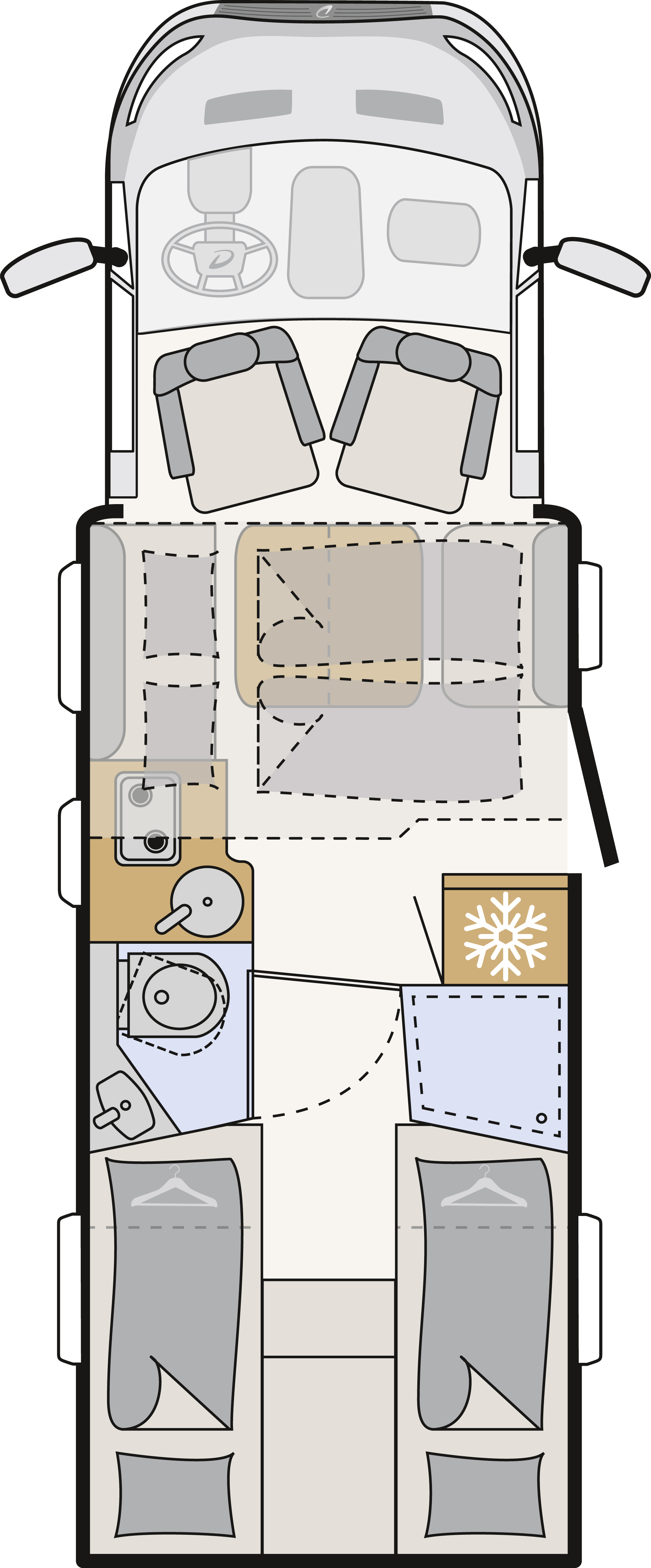 Die durchdachten Grundrisse sorgen für ein hohes Maß an Alltagstauglichkeit. Vorn befindet sich das serienmäßige Hubbett im Bug, im Heck sind komfortable Einzelbetten angeordnet – perfekt für Familien mit Kindern oder Paare, die Wert auf flexible Schlaflösungen legen.